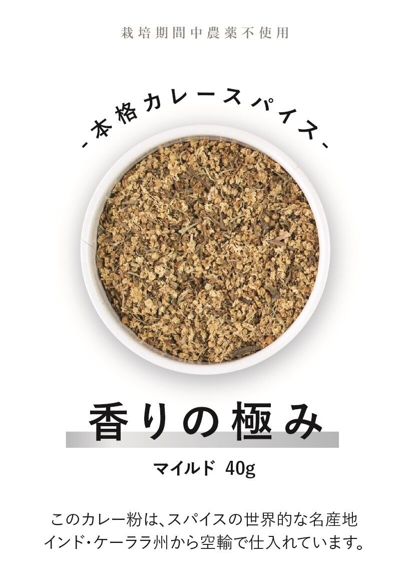 本格カレースパイス 『香りの極み』は、インド・ケーララ州から空輸した新鮮なスパイスを使用し、化学調味料、添加物、塩等、当社のスパイス以外一切を入れず作られたこだわり抜いた純粋なカレー粉です。
