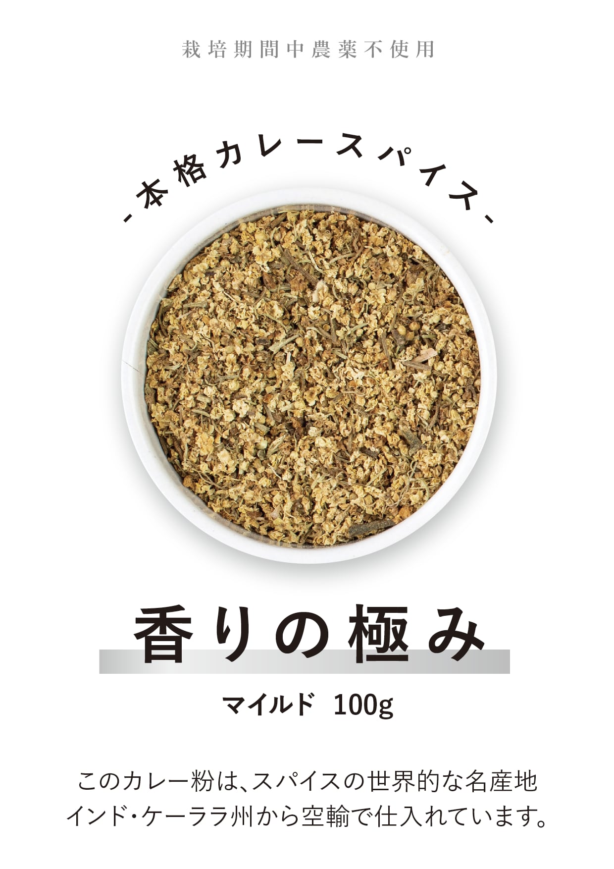 本格カレースパイス 『香りの極み』は、インド・ケーララ州から空輸した新鮮なスパイスを使用し、化学調味料、添加物、塩等、当社のスパイス以外一切を入れず作られたこだわり抜いた純粋なカレー粉です。